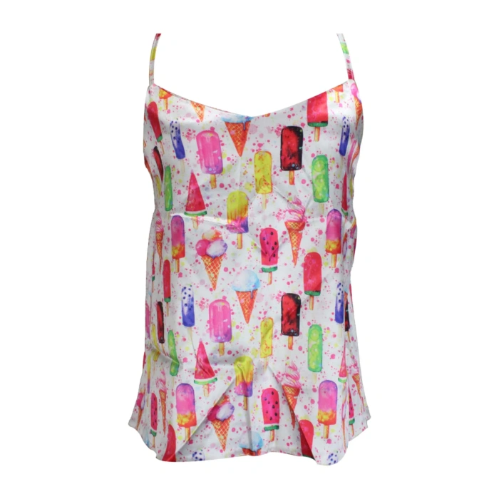 این تاپ ساتن لطیف و خنک، با طرح رنگارنگ بستنی، شما را به دل یک روز گرم تابستانی خواهد برد.